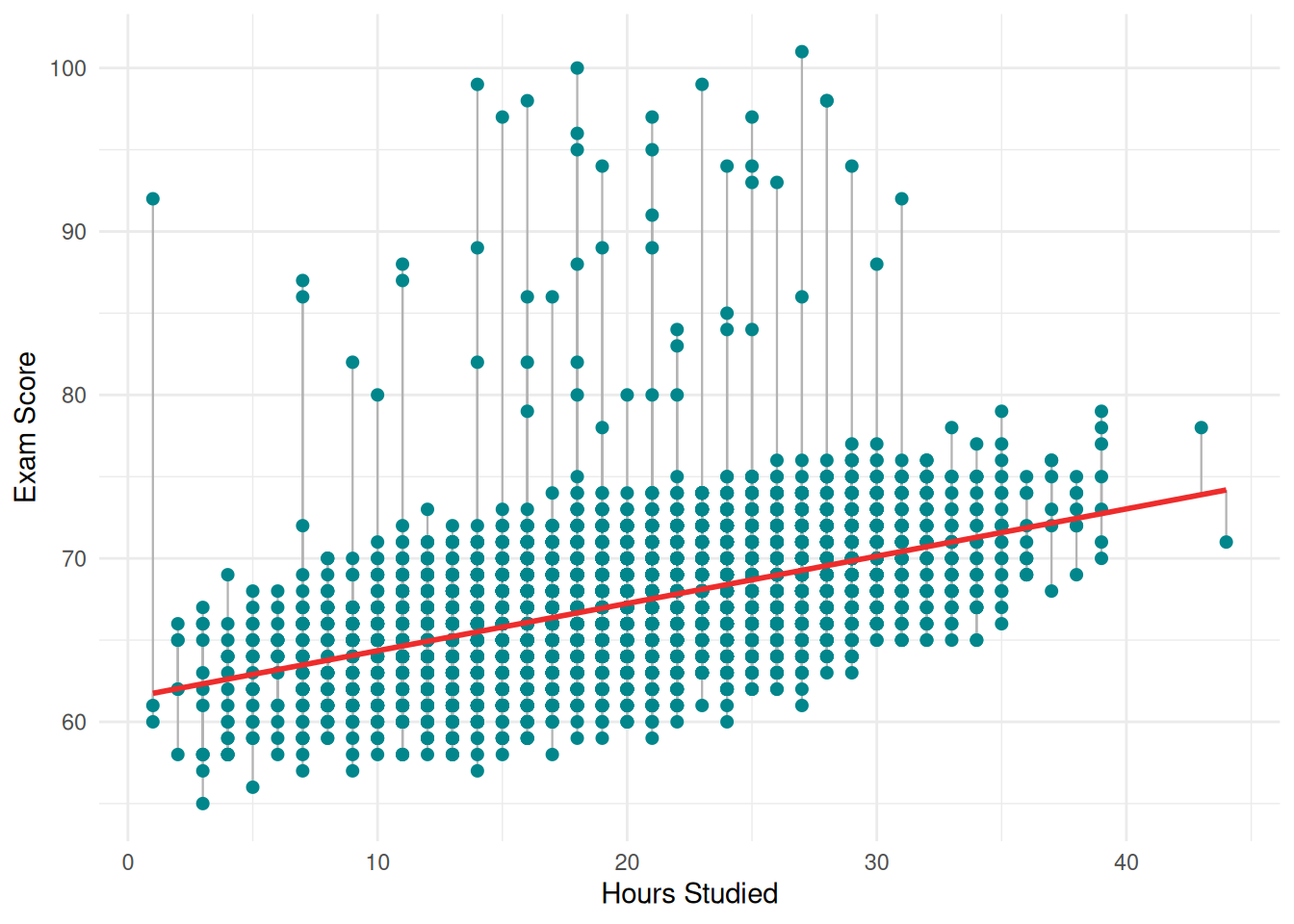 geom_segment(aes(xend = hours_studied, yend = predicted), color = "grey70", linewidth = 0.4) +